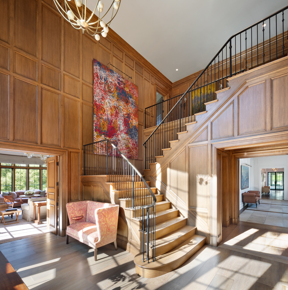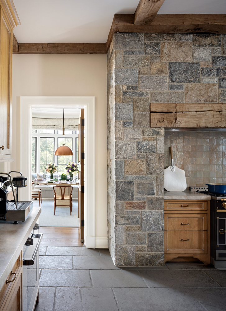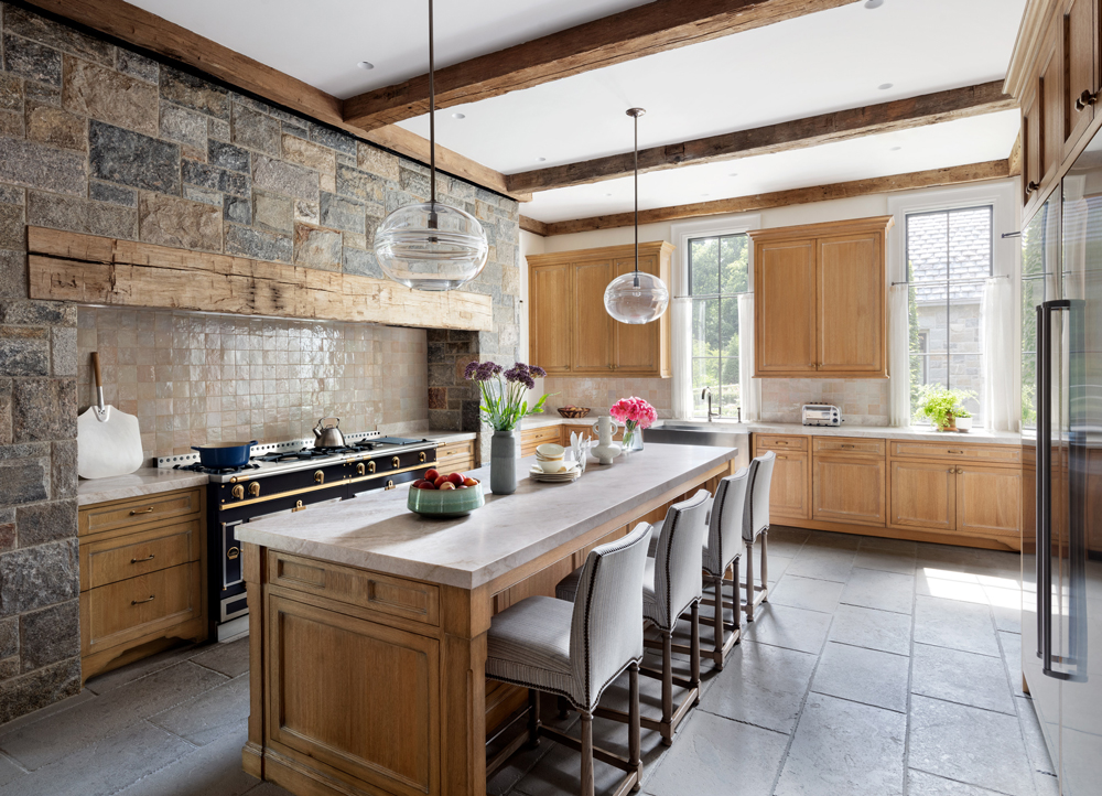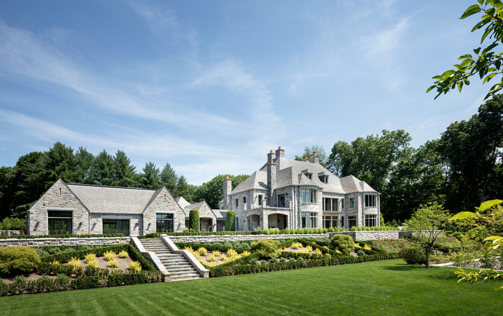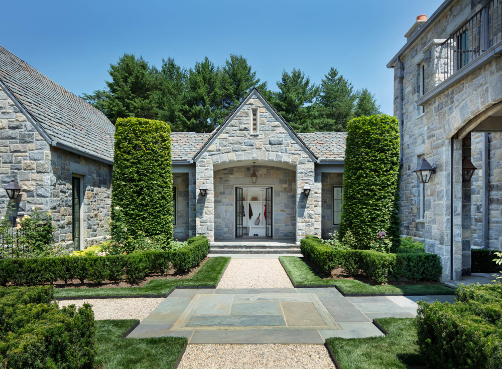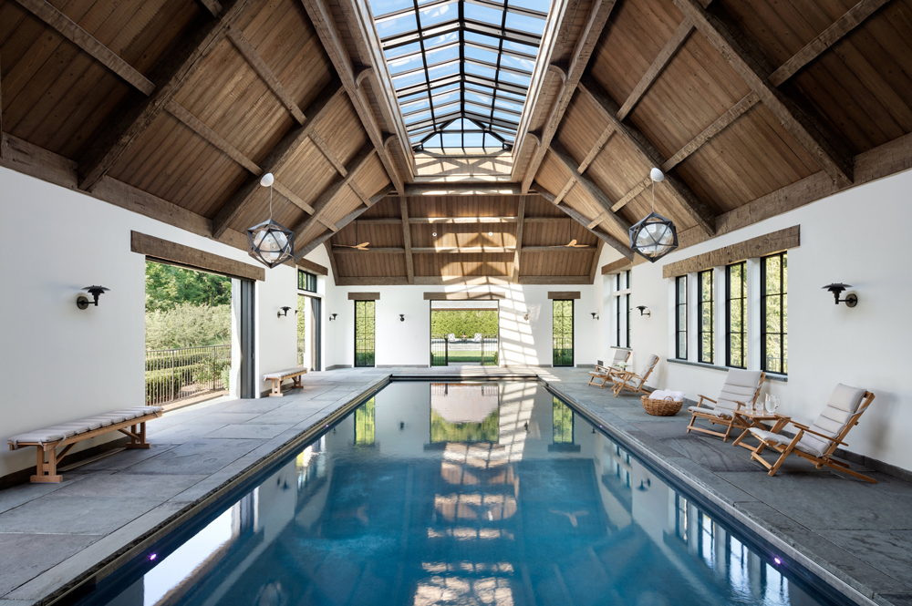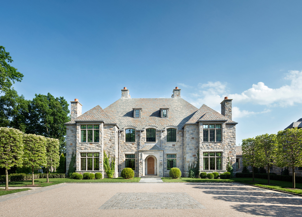 This French Provincial estate in Greenwich is elegant and modern living. Every detail is considered, from the granite lintels and limestone trim to the bronze windows, copper scuppers, and steep slate roof. The custom white oak front door, flanked by a limestone arch and copper lanterns, sets the tone for what’s inside. Inside the two-story stair hall glows with light from a glass bow window, and antique limestone floors, oak millwork, and hand forged railings carry the timeless look throughout. The indoor pool area is like a converted stone barn with a timber roof, antique bluestone pavers, and a sliding wall system that opens to the outdoors in warmer months. A steel skylight above captures sunlight by day and stars by night.