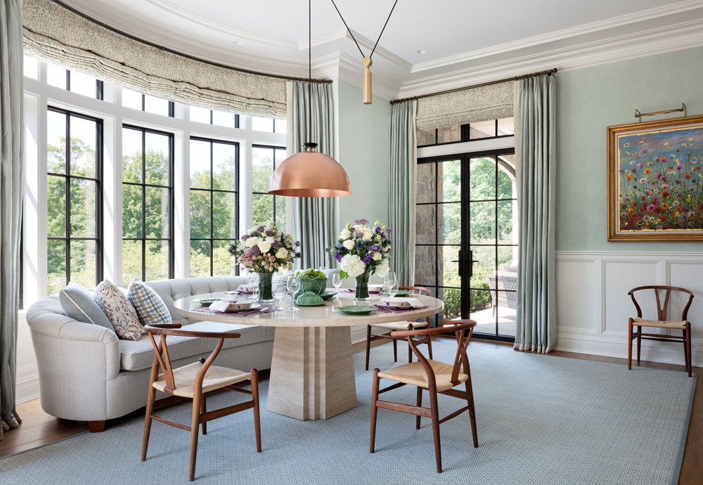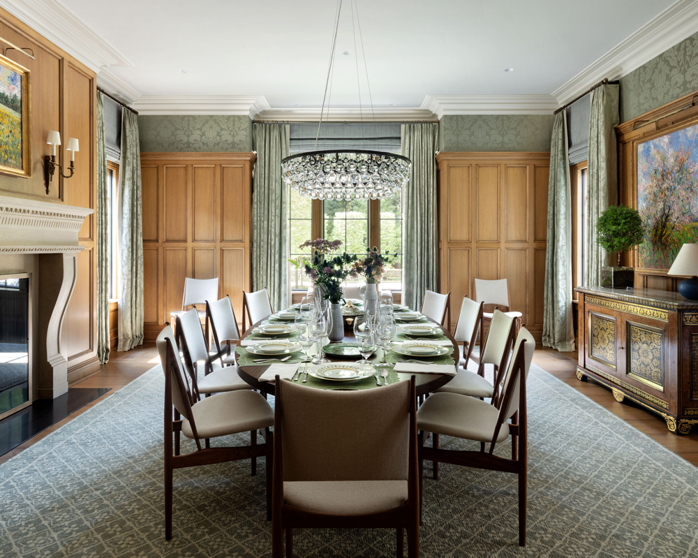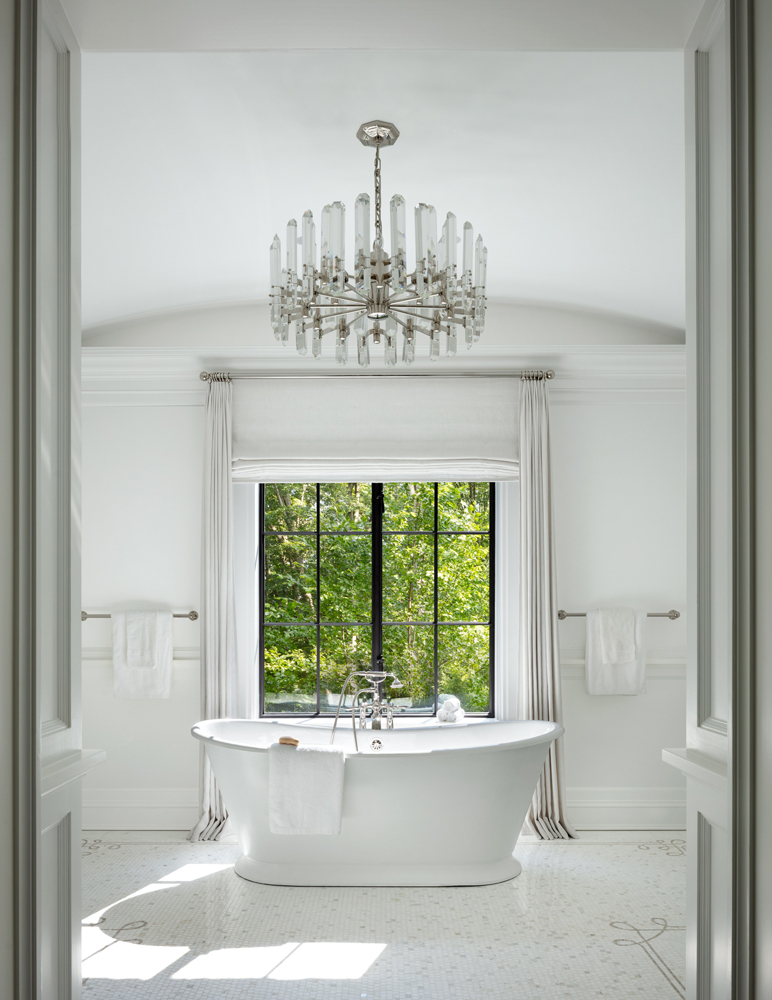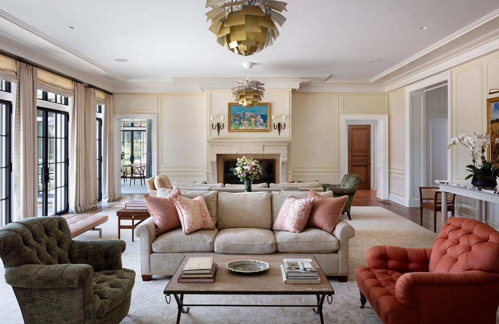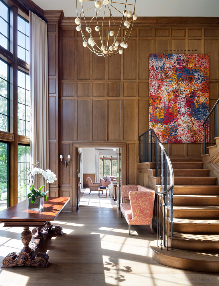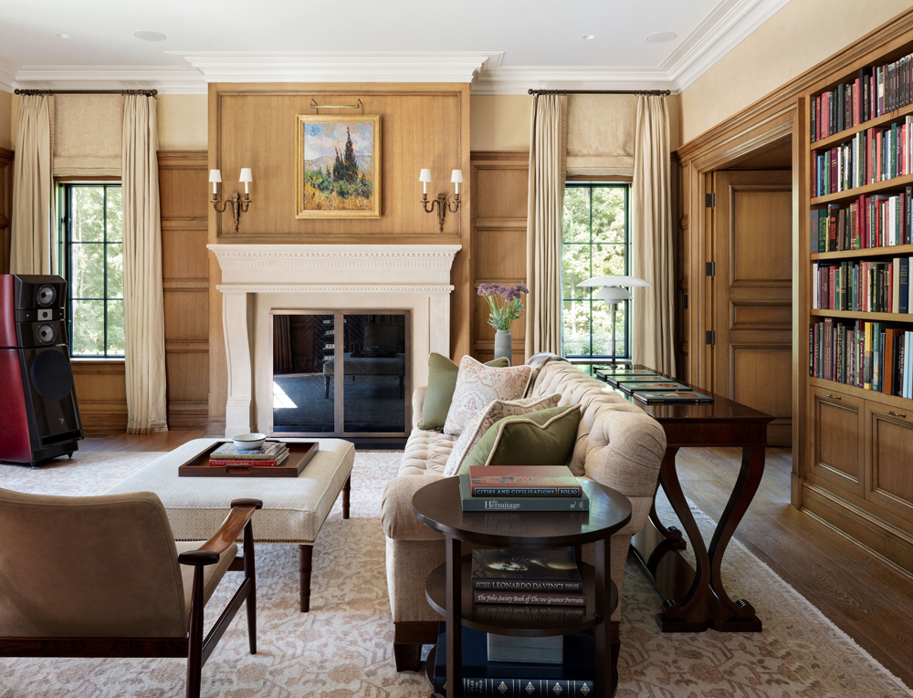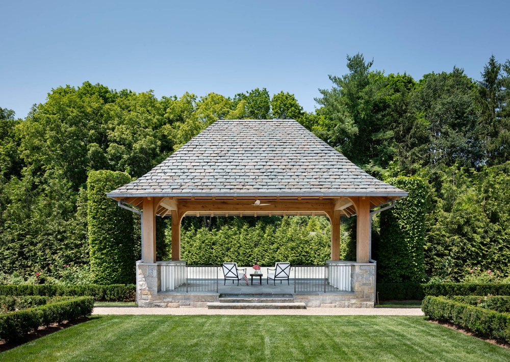 This French Provincial estate in Greenwich is elegant and modern living. Every detail is considered, from the granite lintels and limestone trim to the bronze windows, copper scuppers, and steep slate roof. The custom white oak front door, flanked by a limestone arch and copper lanterns, sets the tone for what’s inside. Inside the two-story stair hall glows with light from a glass bow window, and antique limestone floors, oak millwork, and hand forged railings carry the timeless look throughout. The indoor pool area is like a converted stone barn with a timber roof, antique bluestone pavers, and a sliding wall system that opens to the outdoors in warmer months. A steel skylight above captures sunlight by day and stars by night.