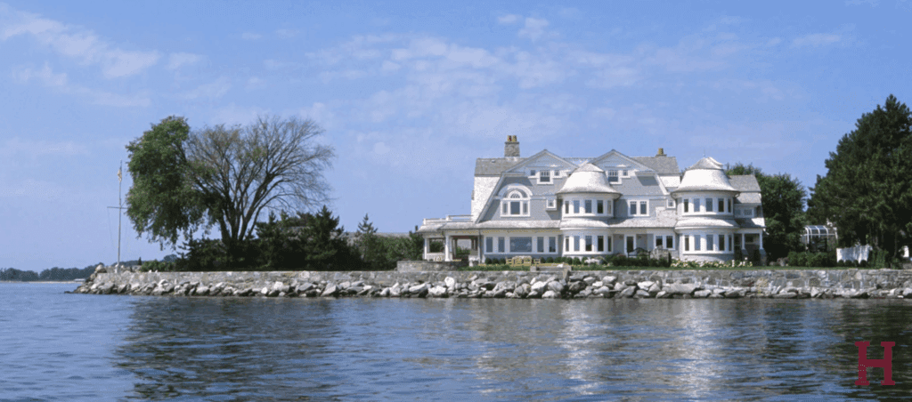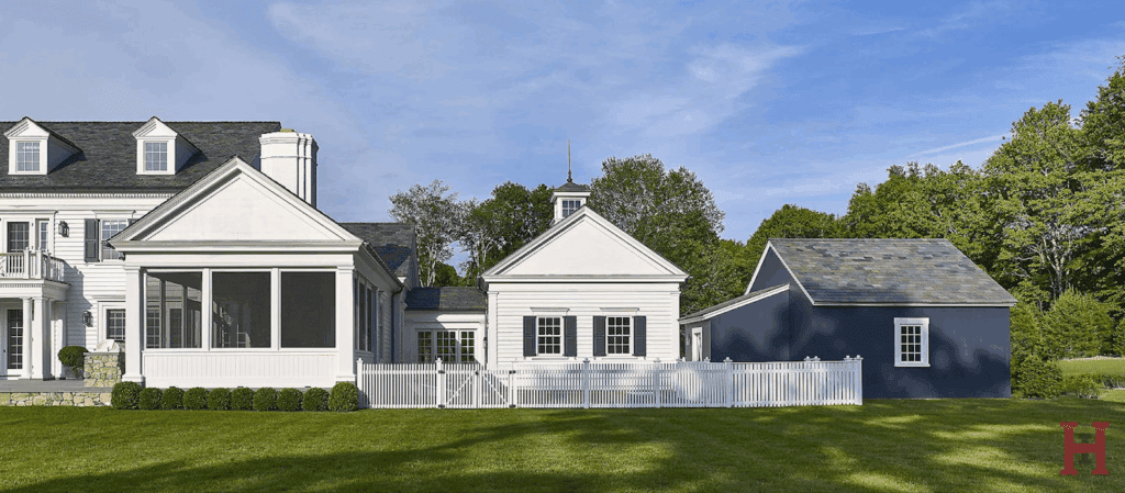 This Nantucket-style residence on a serene peninsula overlooking Long Island Sound features gambrel roofs, open porches, imported mahogany windows, and an octagonal mudroom with a lighthouse-inspired organizer Completed in just 10 months, this custom-built home received a HOBI Award for “Best Fairfield County Custom Home 7,000-8,000sf.”